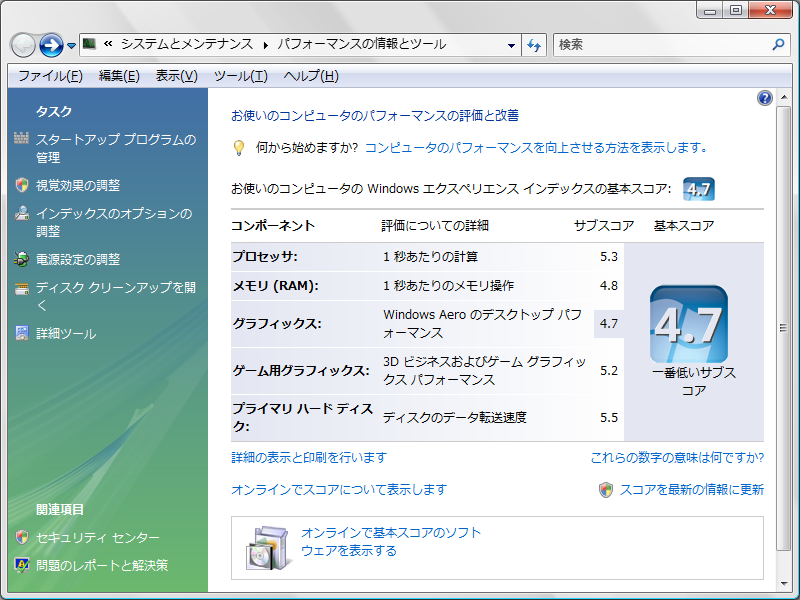 この変更により、Windows エクスペリエンスインデックスの基本スコアが従来の3.2から4.7に向上しました。